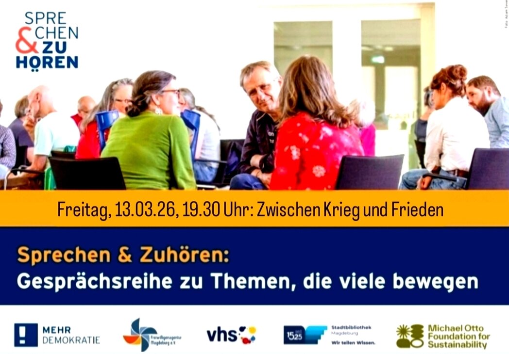 Miteinander sprechen, sich mit anderen austauschen, verschiedene Perspektiven wahrnehmen und sich eine eigene Meinung bilden – das ist das Grundgerüst eines lebendigen Miteinanders in unserer Demokratie, und doch eine enorme Herausforderung. Damit das gelingt, haben Freiwilligenagentur, Volkshochschule und Stadtbibliothek Magdeburg mit Unterstützung des bundesweit engagierten Mehr Demokratie e.V. eine Gesprächsreihe konzipiert, die Themen aufgreift, die aktuell viele Menschen bewegen.