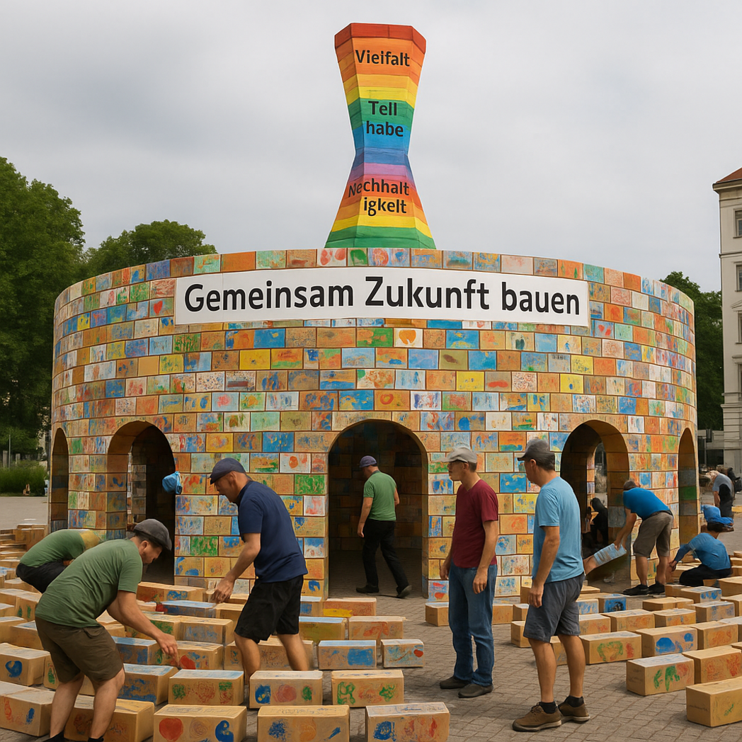 Gemeinsam mit euch und vielen Menschen in ganz Sachsen-Anhalt errichten wir ein großes, begehbares Haus der Zukunft, das in Folge an mehreren Orten in Sachsen-Anhalt aufgebaut wird. Jeder Stein wird von euch gestaltet – mit Wünschen, Bildern und Botschaften für die Gesellschaft, die wir uns wünschen.